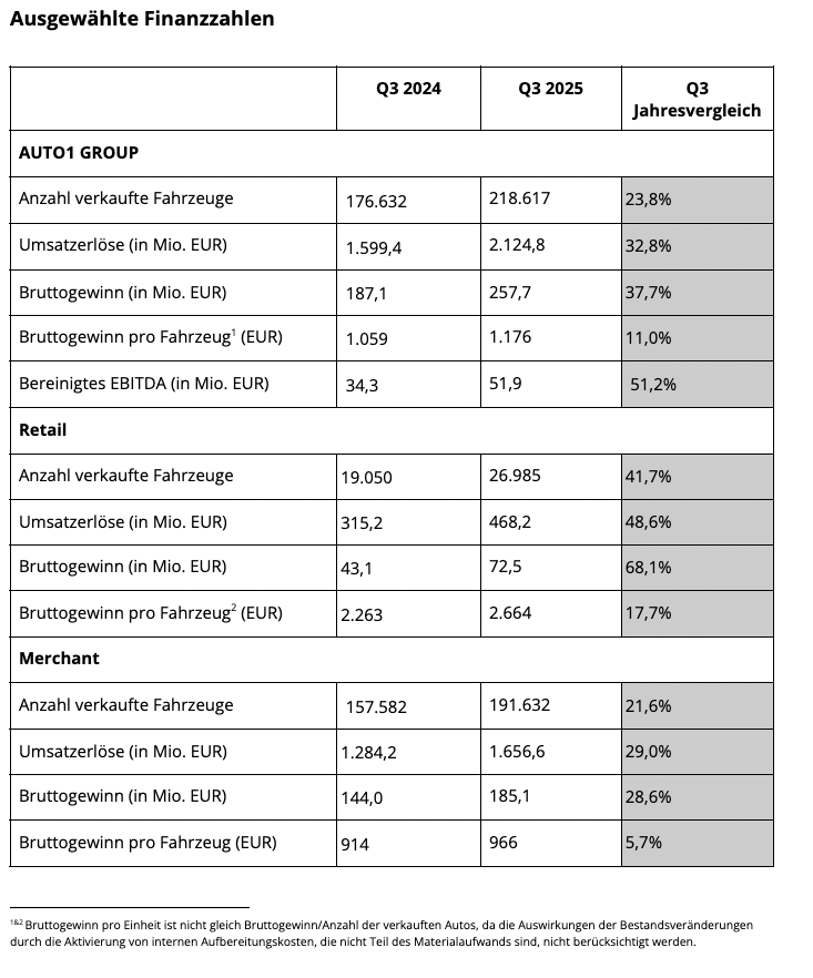 Die Gruppe verkaufte im dritten Quartal insgesamt 218.617 Fahrzeuge, ein Anstieg von 23,8% im Vergleich zum Vorjahr. Mit einem Umsatz von 2,1 Mrd. EUR überstieg der Quartalsumsatz zum ersten Mal die Marke von 2 Mrd. EUR, ein Anstieg von 32,8% im Vergleich zum Vorjahr. Der Bruttogewinn der Gruppe betrug 257,7 Mio. EUR, ein Anstieg von 37,7% im Jahresvergleich. Die AUTO1 Group erreichte im dritten Quartal ein bereinigtes EBITDA von 51,9 Mio. EUR, das ist ein Anstieg von 51,2% im Vergleich zu Q3 2024.
