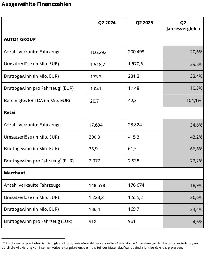 Die Gruppe verkaufte im zweiten Quartal insgesamt 200.498 Fahrzeuge, ein Anstieg von 20,6% im Vergleich zum Vorjahr. AUTO1 Group erzielte einen Umsatz von 2,0 Mrd. EUR, ein Anstieg von 29,8% im Vergleich zum Vorjahr. Der Bruttogewinn der Gruppe betrug 231,2 Mio. EUR, ein Anstieg von 33,4% im Jahresvergleich. Die AUTO1 Group erreichte im zweiten Quartal ein bereinigtes EBITDA von 42,3 Mio. EUR, das ist ein Anstieg von 104,1% im Vergleich zu Q2 2024.