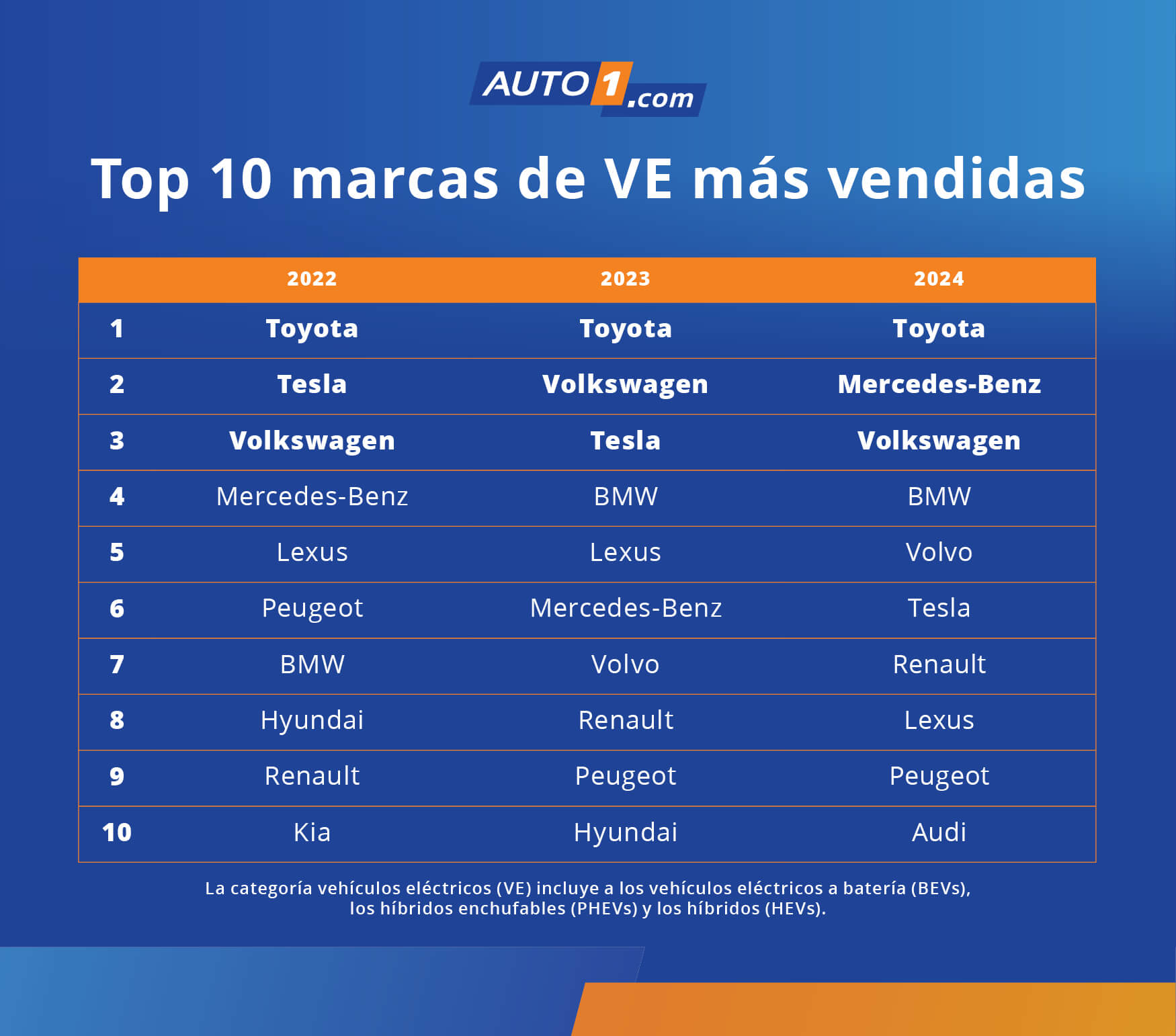 Por volumen de coches vendidos en AUTO1.com, Toyota, Mercedes-Benz y Volkswagen son las marcas que dominan los tres primeros puestos. Por primera vez en este análisis desde 2021, Tesla no se ha asegurado una posición en el top 3 y desciende hasta el sexto lugar. Toyota conservó su posición como marca líder por cuarto año consecutivo, manteniendo su dominio en el mercado. Mercedes ha experimentado un fuerte incremento, subiendo del sexto puesto en 2023 al segundo en 2024, impulsada por un impresionante crecimiento interanual del 66% en unidades vendidas en AUTO1.com. Volkswagen, que ocupaba la segunda posición el año pasado, pasó al tercer puesto en 2024, experimentando un descenso interanual del 12%. BMW se mantiene en cuarto lugar, con un sólido crecimiento interanual del 12%, mientras que Volvo sube del séptimo al quinto puesto con un aumento interanual del 44%. Las marcas chinas MG (257% de aumento) y Lynk & Co (veinte veces más) registraron las mayores tasas de crecimiento interanual, consolidando aún más su presencia en el mercado europeo de vehículos eléctricos.