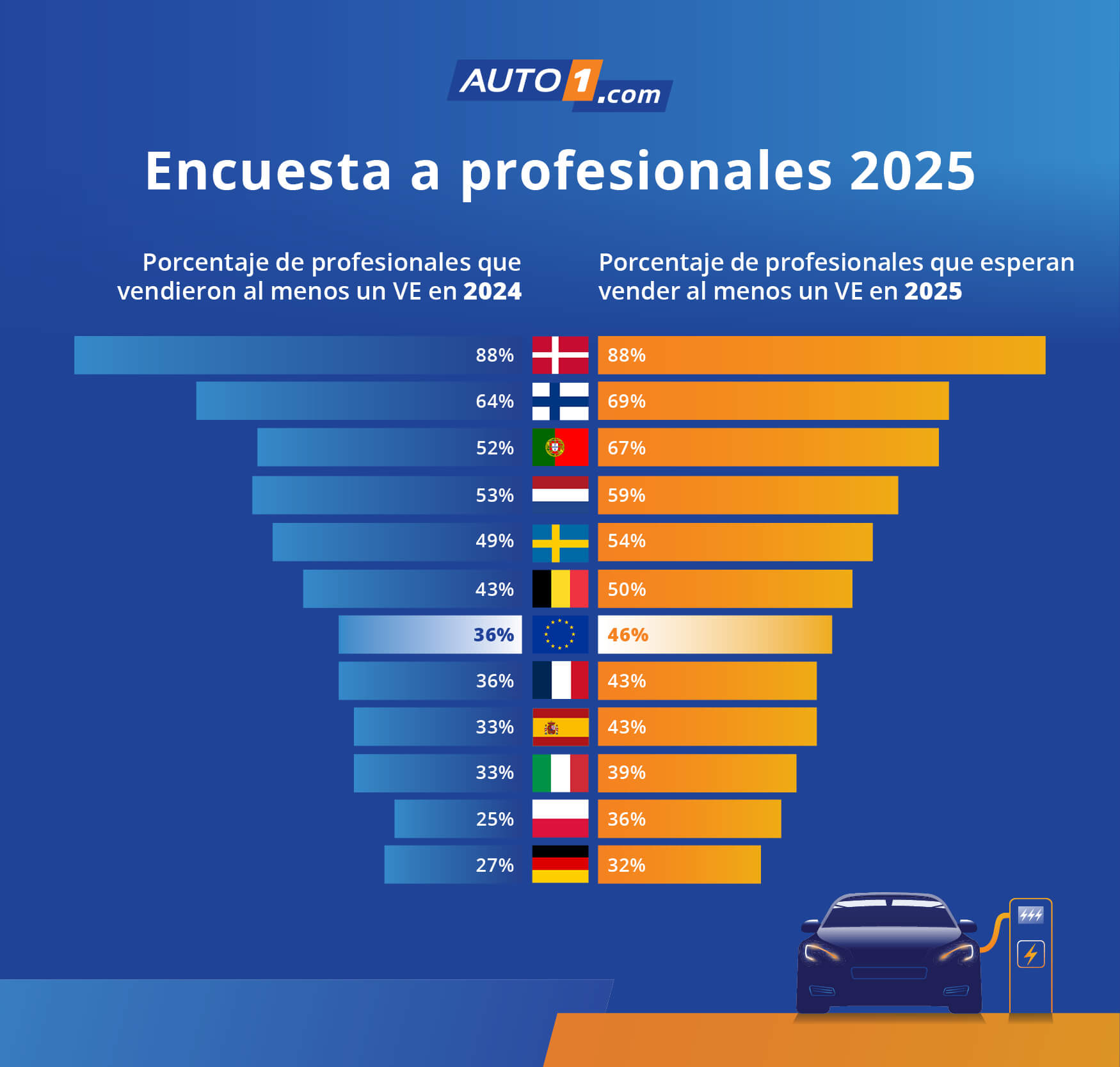 Según una encuesta online realizada por AUTO1.com entre sus socios profesionales, el 36,1% de los concesionarios europeos vendieron al menos un VE en 2024, frente al 35,2% en 2023, lo que supone un ligero aumento de 2,4 puntos porcentuales respecto al año anterior. De cara a este año, casi la mitad (46,1%) espera vender al menos un VE en 2025, mientras que en 2024 estas expectativas eran menores, del 44,2%.