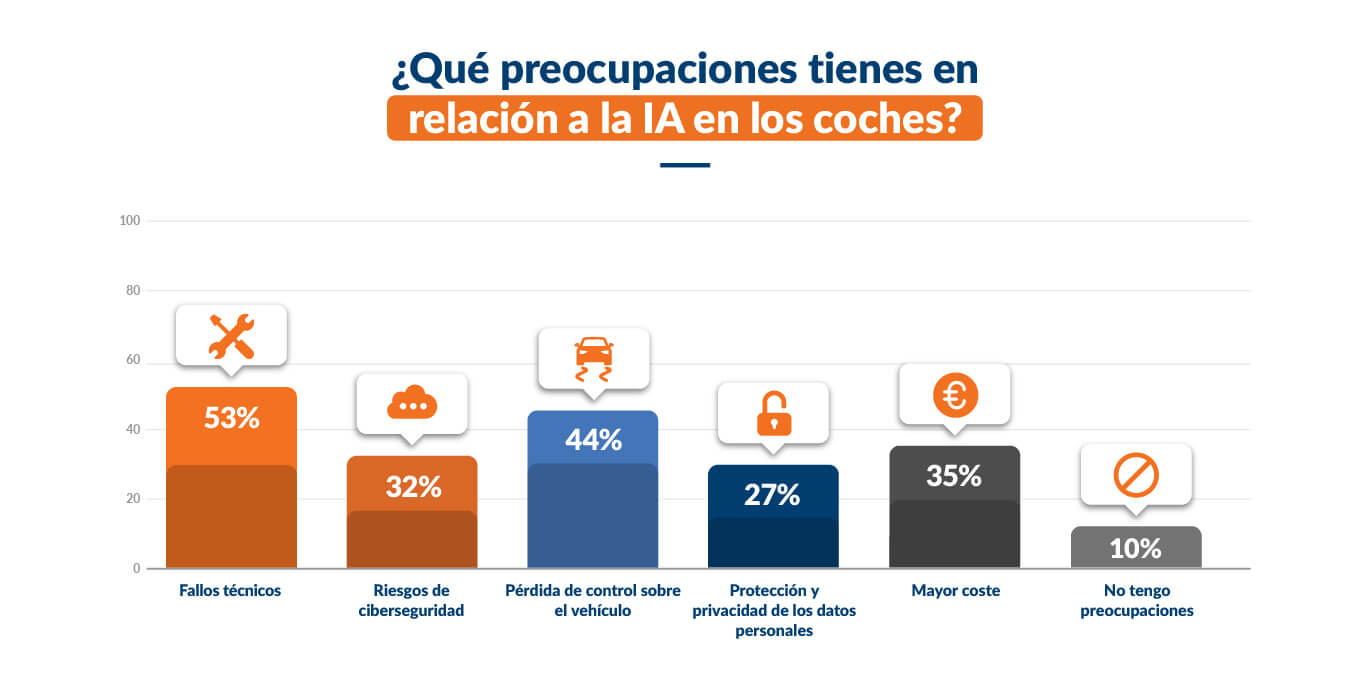 A pesar de la alta confianza, los consumidores españoles también expresan ciertas preocupaciones relacionadas con la IA en los coches. Las tres más citadas son: para un 53%, los posibles fallos técnicos, para el 44%, la idea de perder el control sobre el vehículo y, para un 35%, que suponga un mayor coste. En lo que respecta a la privacidad y recopilación de los datos personales, sólo al 25% de los españoles les preocupa "mucho o gran medida". Para aumentar la sensación de seguridad en este ámbito, el 44% de los encuestados afirma que se sentiría más seguro con la posibilidad de borrar todos sus datos cuando lo desee; al 43% le haría sentir más seguro una opción de no compartir sus datos y a otro 43% le haría sentir más seguro una regulación legal que los proteja.