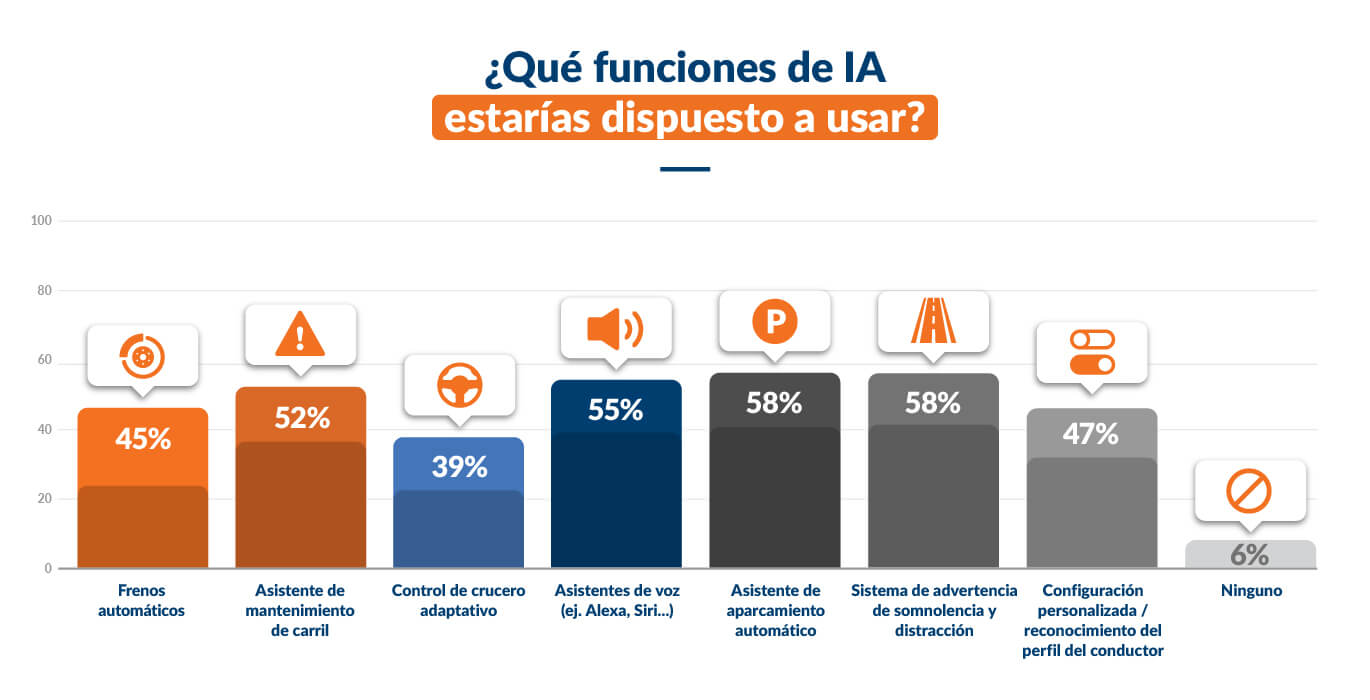 Preguntados sobre qué funciones de IA estarían más dispuestos a usar en el coche, las más populares entre los españoles son: los sistemas de advertencia de somnolencia y distracción y la asistencia de aparcamiento automático, ambos para un 58%. A continuación, le siguen los asistentes de voz (55%), el asistente de mantenimiento de carril (52%) y la configuración personalizada o la posibilidad de reconocimiento del perfil del conductor para adaptar las características del coche como la temperatura, asiento o luces, para un 47%.