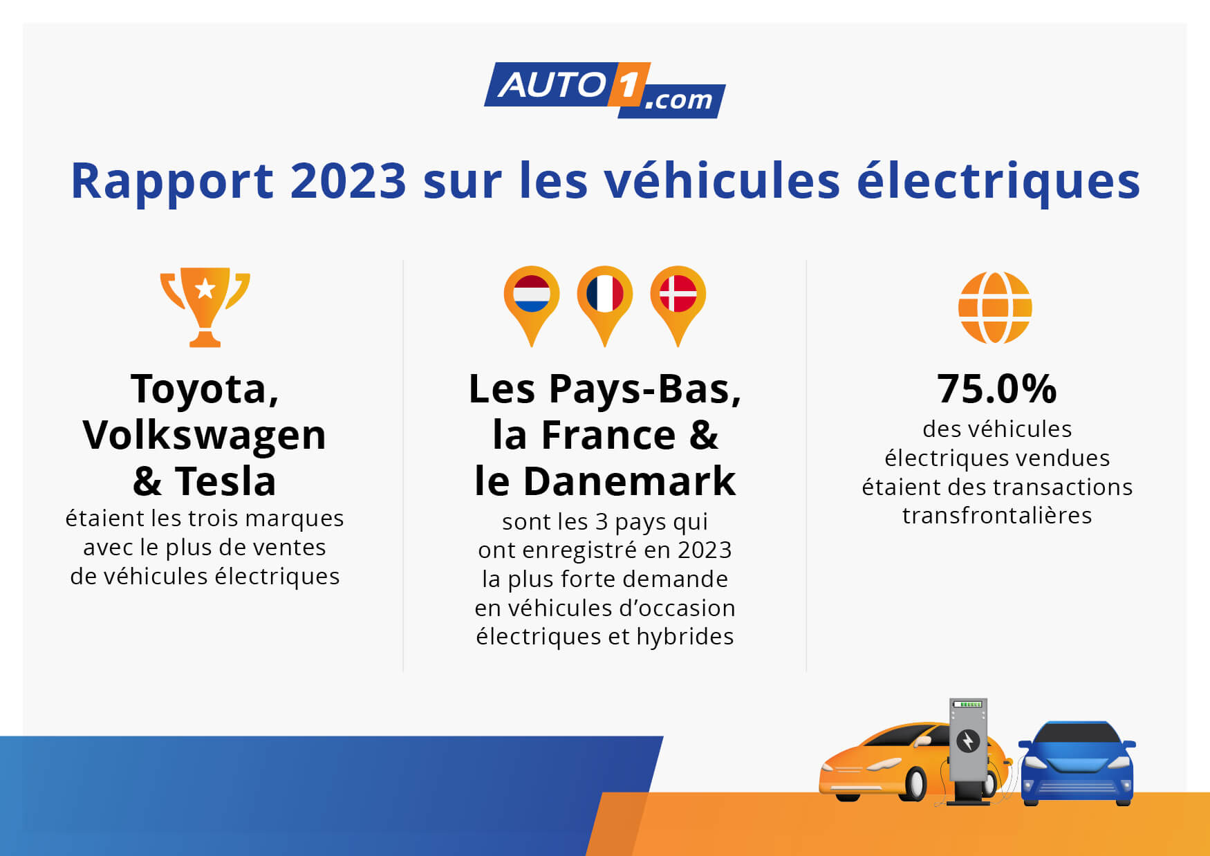 Environ 75 % des transactions de véhicules électriques en 2023 se sont faites à travers les frontières sur la plateforme B2B européenne en 2023. Les Pays-Bas ont maintenu leur position de leader avec la plus forte demande de VE sur AUTO1.com suivis par la France, passée de la quatrième place en 2022 à la deuxième place en 2023 avec une augmentation de 30 % entre 2022 et 2023. Le Danemark conserve la troisième position pour la troisième année consécutive, suivi par l'Allemagne et l'Espagne aux quatrième et cinquième places. Après deux ans en deuxième position, la Finlande est passée à la sixième place dans le classement des pays avec les plus fortes demandes de VE d'AUTO1.com en 2023.