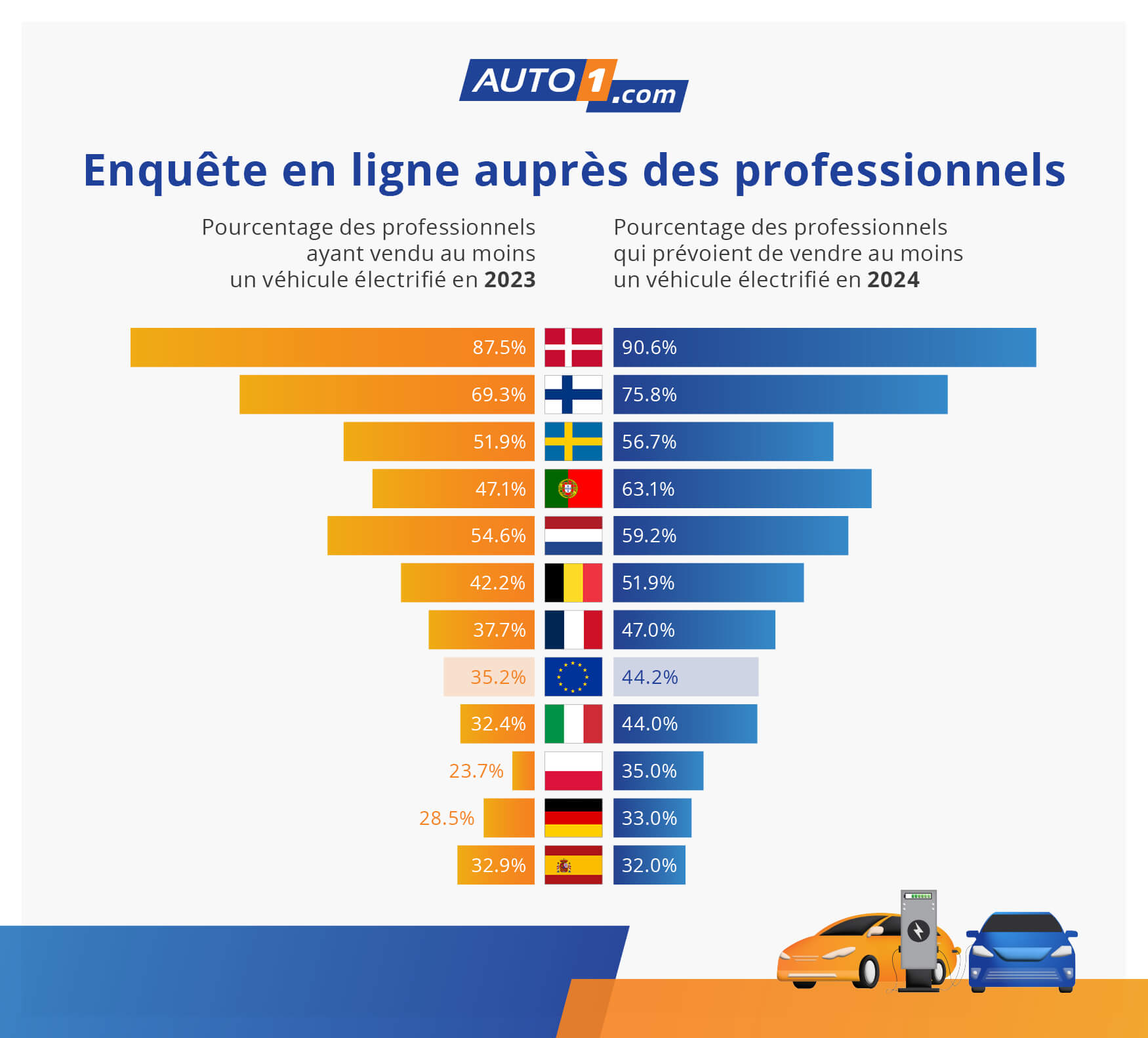 En 2023, environ 17 000 véhicules électriques ont été vendus sur la plateforme, représentant 3,2 % des véhicules d’occasion vendus par AUTO1.com, en légère hausse par rapport aux 3,1 % de 2022. Selon une enquête en ligne réalisée par AUTO1.com auprès de ses partenaires professionnels européens, 35,2 % d’entre eux ont répondu avoir vendu au moins un VE en 2023, contre 32,7 % en 2022, soit une légère augmentation de 2,6 points de pourcentage d'une année sur l'autre. Les prévisions pour 2024 montrent que 44,2 % des partenaires professionnels d'AUTO1.com s'attendent à vendre au moins un VE en 2024 alors qu'en 2023, ces attentes étaient seulement de 39,9 %.