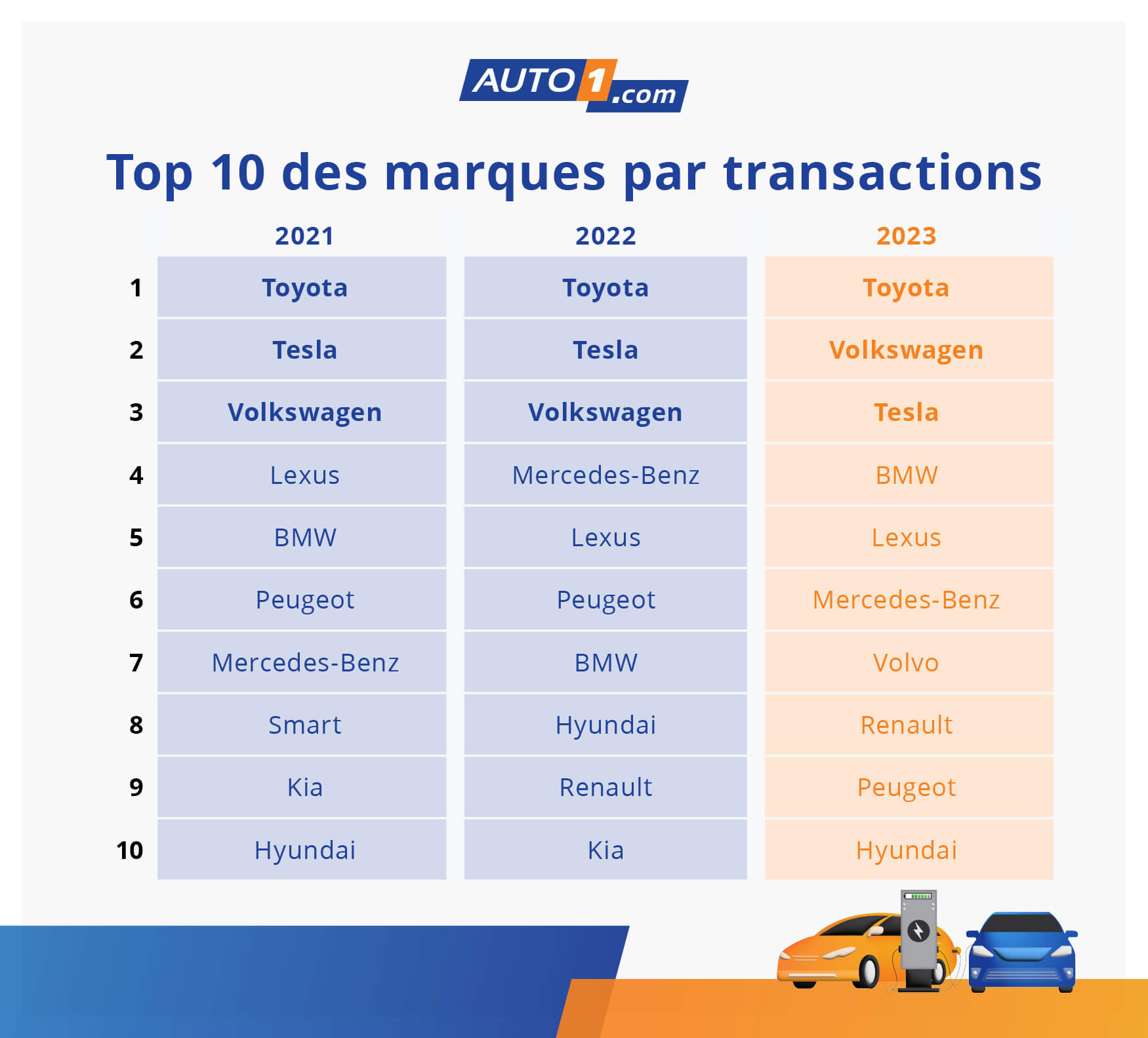 Toyota, Volkswagen et Tesla ont continué à dominer les trois premières places pour la troisième année consécutive des véhicules électriques vendus sur AUTO1.com en 2023, Toyota occupant la première place. Volkswagen est passé de la troisième position en 2022 à la deuxième position en 2023 avec une augmentation de 30,6 % des unités vendues par rapport à 2022. Volvo a réalisé une croissance de près de 90 % d'une année sur l'autre, la propulsant dans le Top 10 pour la première fois. Kia a quant à elle quitté ce top 10. Parmi le top 20 des marques de VE vendues sur la plateforme, Cupra avec 321,1 % (croissance d'une année sur l'autre) et Jeep avec 158,6 % (croissance d'une année sur l'autre) se sont démarqués avec des chiffres de croissance impressionnants en 2023.