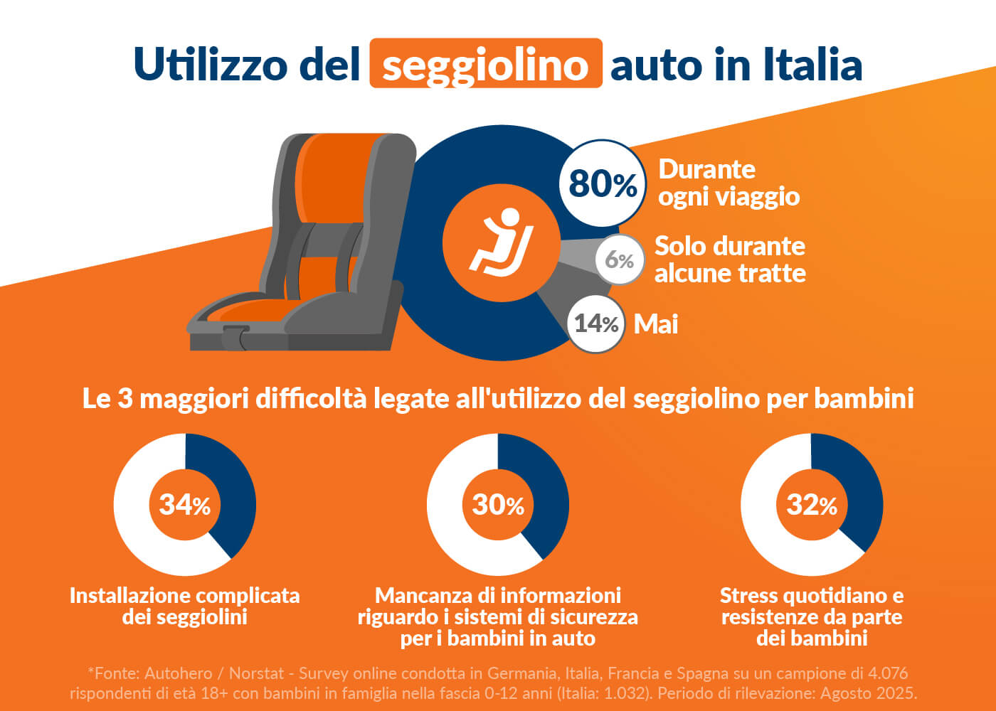 - Fonte: Autohero / Norstat - Survey online condotta in Germania, Italia, Francia e Spagna su un campione di 4.076 rispondenti di età 18+ con bambini in famiglia nella fascia 0-12 anni (Italia: 1.032). Periodo di rilevazione: Agosto 2025. ↩