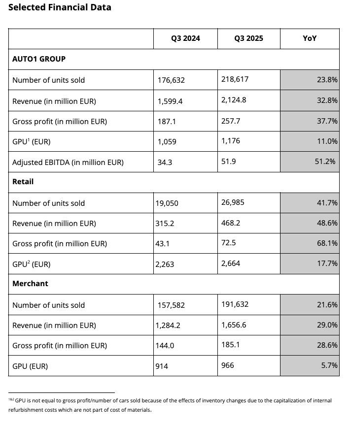 The Group sold a total of 218,617 units in Q3, up 23.8% year over year. For the first time in company history, quarterly revenue exceeded EUR 2 billion, reaching EUR 2.1 billion in the third quarter, up 32.8% year over year. The Group reported EUR 257.7 million gross profit, up 37.7% year over year and AUTO1 Group achieved EUR 51.9 million adjusted EBITDA, a 51.2% increase year over year.